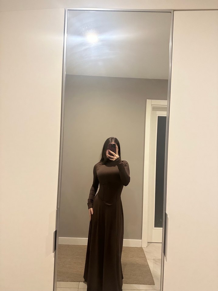 Koyu kahverengi, uzun kollu ve yüksek yakalı, ince kesim ve ipeksi dokulu sade uzun elbise, ofis için uygun klasik şıklık sunar. ✨
