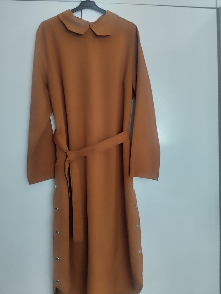 Kahverengi, uzun kollu, yakalı ve kuşaklı bu tunik, regular fit ve minimalist tasarıma sahiptir. Sentetik kumaştan üretilmiş, sokak modasına uygun.