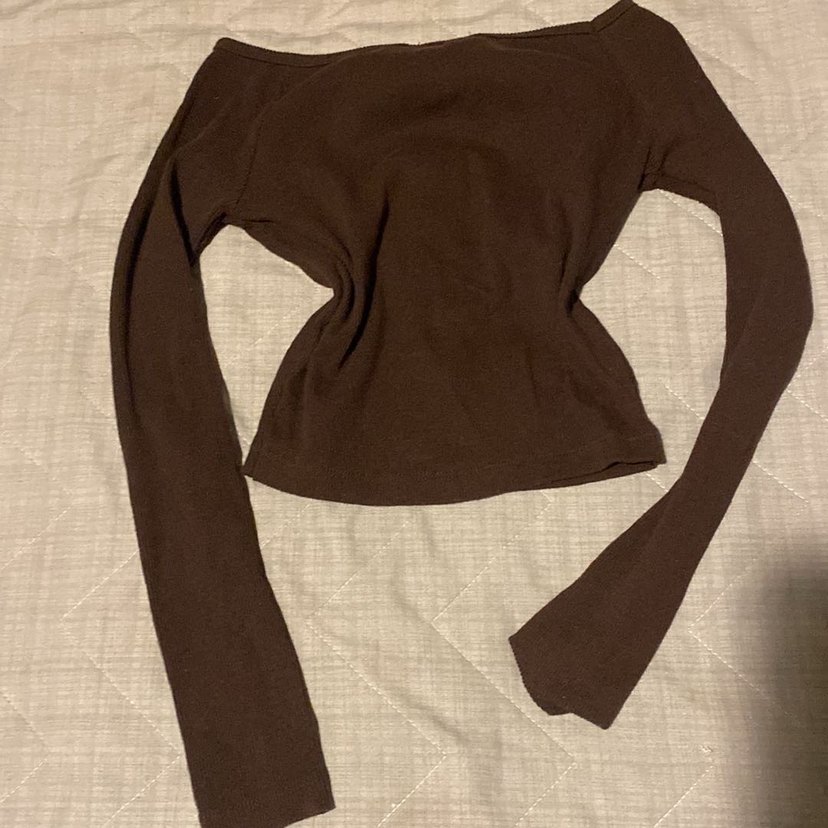 Kahverengi, uzun kollu, tek renk ve rahat keten kumaştan yapılmış, midi uzunluğunda, sade ve şık kadın kazak.