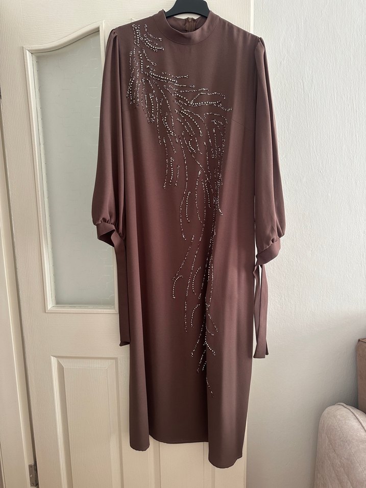 Kahverengi Uzun Kollu Nakışlı Salaş Elbise