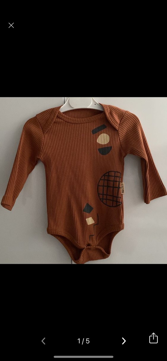Koyu kahverengi, uzun kollu ve bisiklet yaka örgü bebek body. Minimal soyut desenlerle rahat ve şık bir seçim.