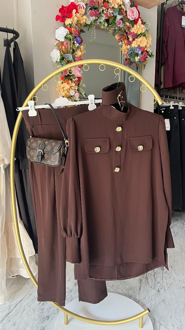 Kahverengi, ipeksi kumaşlı kadın takımı, yüksek yakalı ve düğmeli önlüdür. Uzun kollu ve baskılı deseniyle günlük kullanıma uygundur.