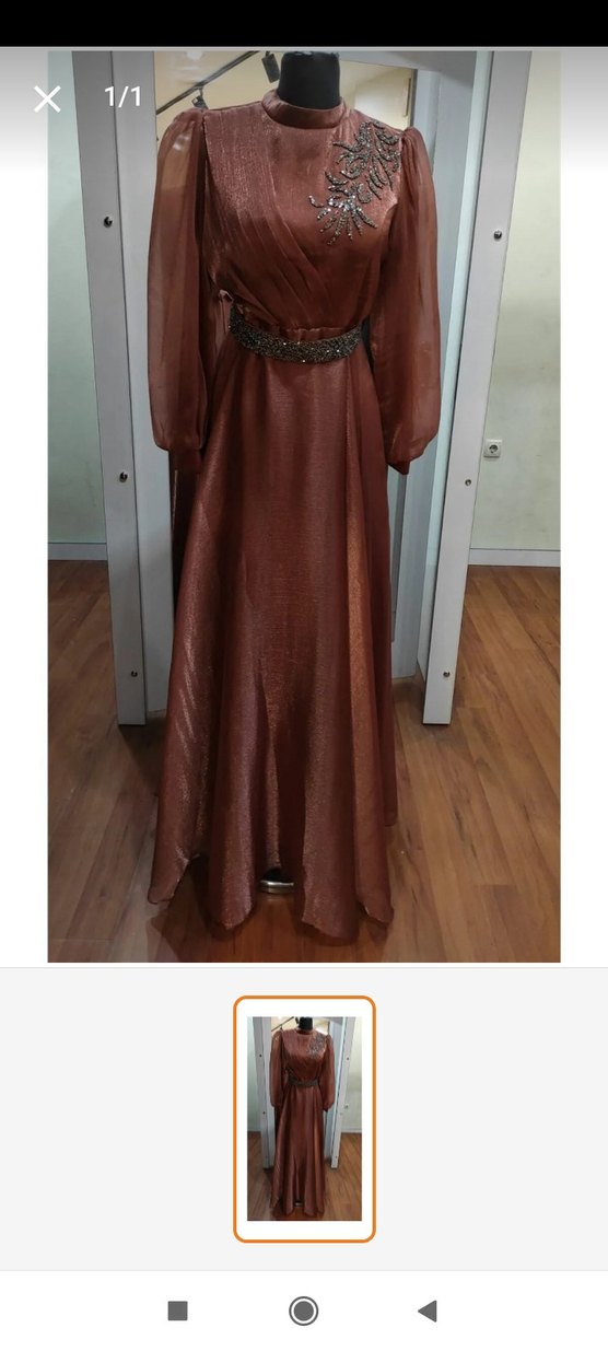 Kahverengi, parlak kumaştan, uzun kollu ve tek parça uzun abiye elbise. Yaka tipi kayık, klasik ve gösterişli tarzda, düğünler için uygun.sadece iki defa kullanıldı yepyeni tertemiz hiç bir sorunu yok...