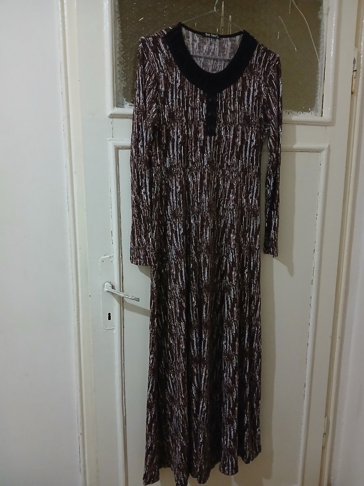 boyu 135 cm, kol boyu 63 cm, iki kol arası 42 cmdir. likralıdır Uzun, bol kesim kadın elbisesi uzun kollu ve V yaka detaylıdır. Sentetik kumaştan yapılmış, koyu kahverengi batik desenli ve piliselidir, bohem ve çağdaş tarzı yansıtır. #elbise #günlükelbise #likralıelbise