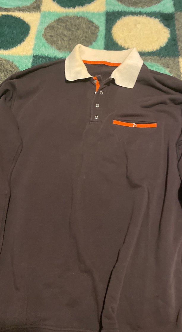 Kahve renkte bej yakalı ve düğmeli uzun kollu bol kesim erkek polo tişört. Turuncu detaylı göğüs cebine sahip, yumuşak ve sıcak kumaştan üretilmiştir. Sokak tarzı için uygun.
