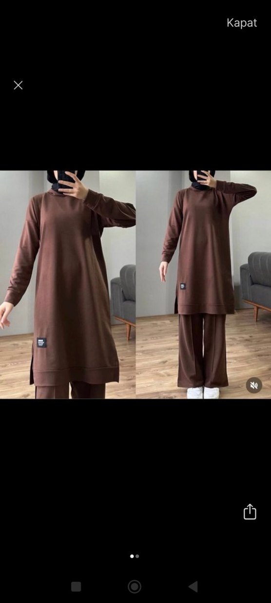 Kahverengi, uzun kollu ve yuvarlak yaka kadın takımı, rahat kesim ve yumuşak, sıcak kumaştan yapılmıştır. Minimalist tarzda, günlük kullanıma uygun.