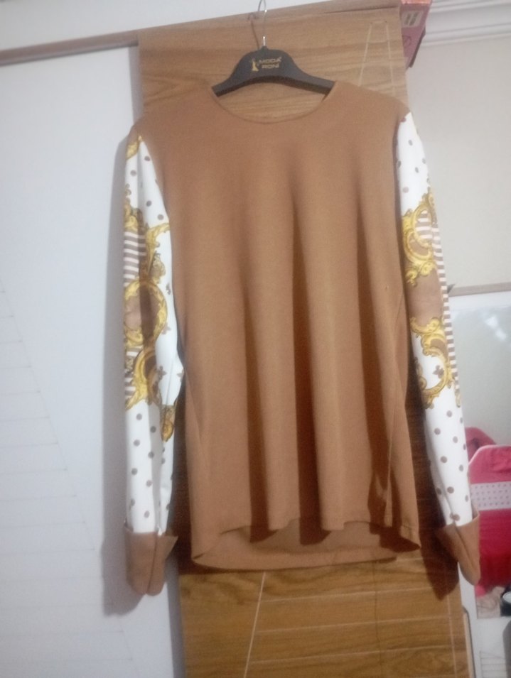 Kahverengi, uzun kollu, salaş kesim bluz, yuvarlak yaka ve normal midi boydadır. Sentetik kumaştan, kollarında desenli detaylar bulunur. Günlük rahat stil için uygun. hiç giyilmedi