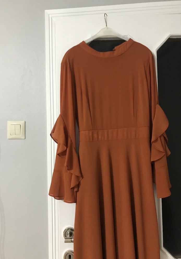 Kahverengi, salaş kesim uzun kollu elbise, drapeli detaylar ve yuvarlak yaka ile. Satenimsi parlak kumaştan, modern klasik ofis tarzına uygun.✨tarçın rengi, fotograftakinden daha 2 ton daha koyu, 1 kez giyildi. Hiçbir kusuru yoktur.