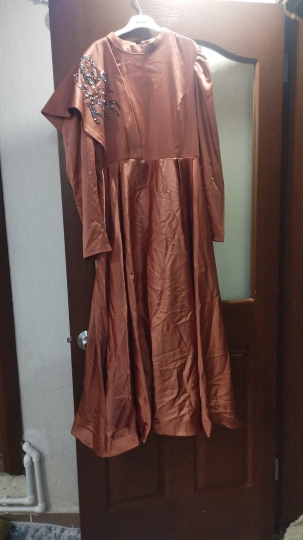 Kahverengi, uzun kollu, salaş kesim kadın elbise. Drapeli tasarımı ve yakasında çentikli yaka detayı bulunur. Parlak dokusu bohem ve sade tarzı yansıtır. temiz
