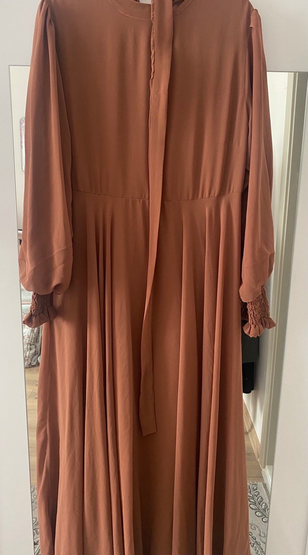 Kahverengi uzun kollu elbise, yüksek yaka ve salaş kesimle vintage bohem tarz sunar. İpek dokulu kumaştan, ofis için uygun ve desen içermeyen modeldir. 44-46 bedene uygundur