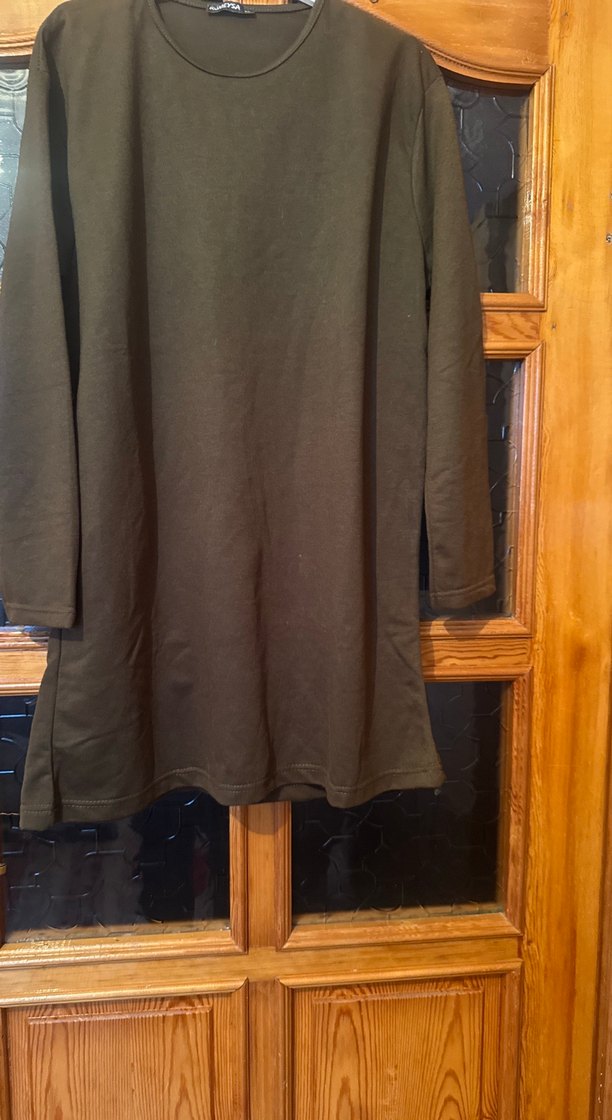 Kahverengi uzun kollu kadın tunik, yumuşak sentetik kumaştan, salaş kesimlidir. Bisiklet yaka ve drapeli, desensiz tasarımıyla rahat ve sade bir görünüme sahiptir. Günlük kullanıma uygundur.