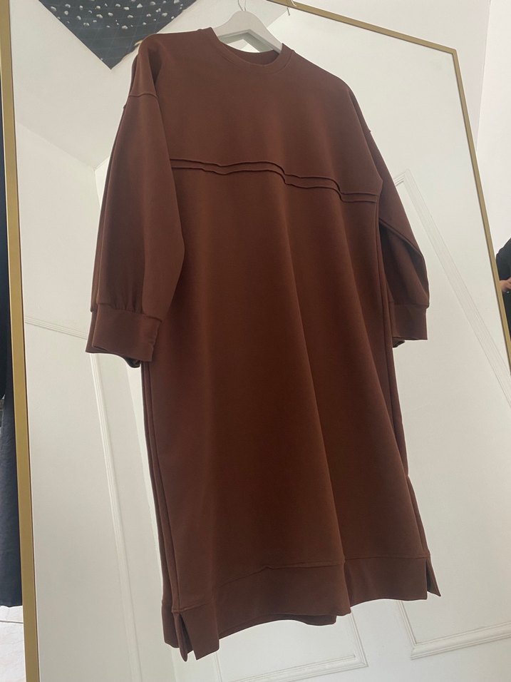 Koyu kahverengi, salaş kesim, drapeli detaylı, uzun kollu ve yuvarlak yakalı, yumuşak sentetik kumaştan yapılmış günlük kullanıma uygun tunik.