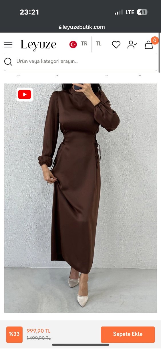 Kahverengi uzun kollu saten elbise, yüksek yakalı ve drapeli detaylıdır. Düzenli kesim, minimalist ve modern tarzıyla ofis için uygundur.