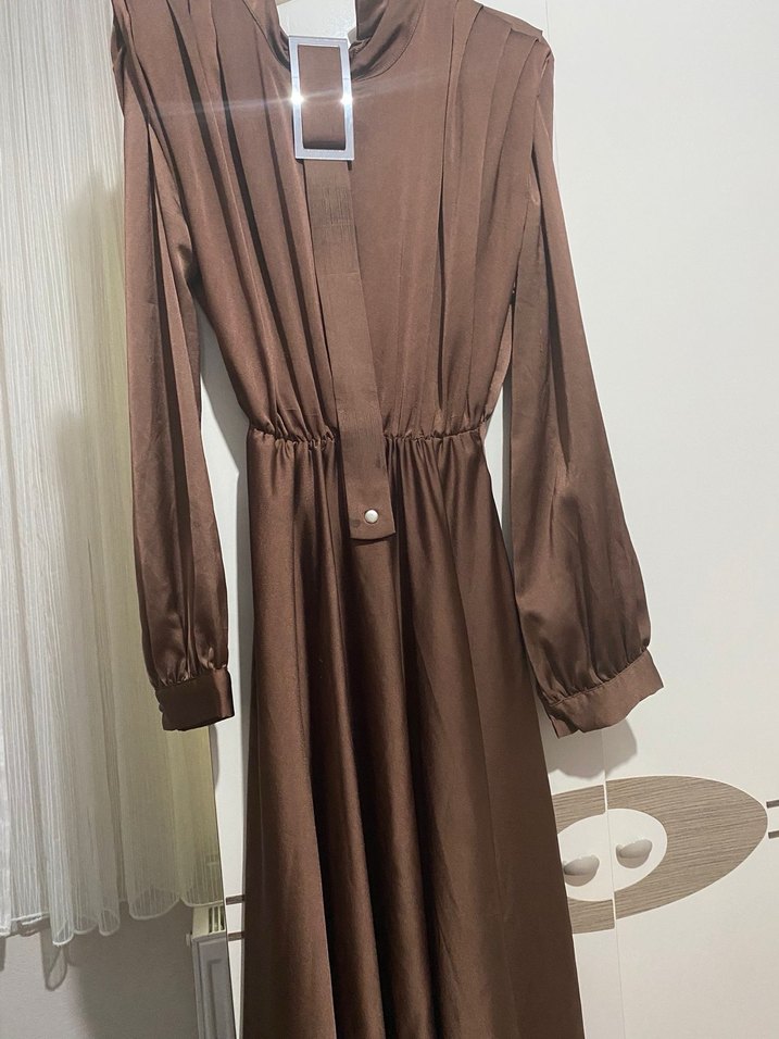 Kahverengi Uzun Kollu Saten Kadın Elbise