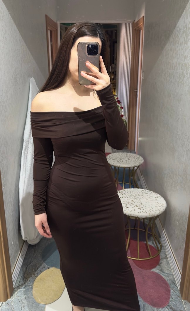 Kahverengi, uzun kollu, straplez kesim ve vücuda oturan bu elbise ipeksi kumaştan yapılmış olup, drapeli detaylara sahiptir. Romantik akşamlar için uygundur. Hiç kullanılmamış
