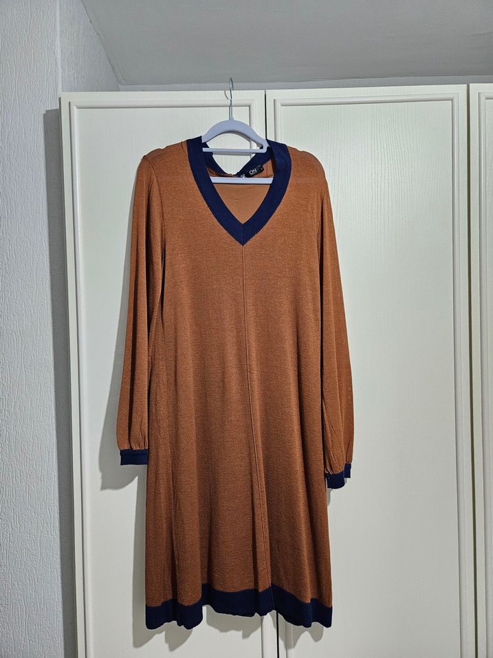 Uzun, bol kesim triko elbise, uzun kollu ve V yaka ile dikkat çeker. Sentetik kumaştan üretilmiş, vintage ve modern detayları birleştirir. Ofis için uygundur. Arkasında lacivert kurdele detayi vardir. hic giyilmedi. on triko marka,2 beden. icinde astar var. cizmelerle cok sık kombinlenebilir.