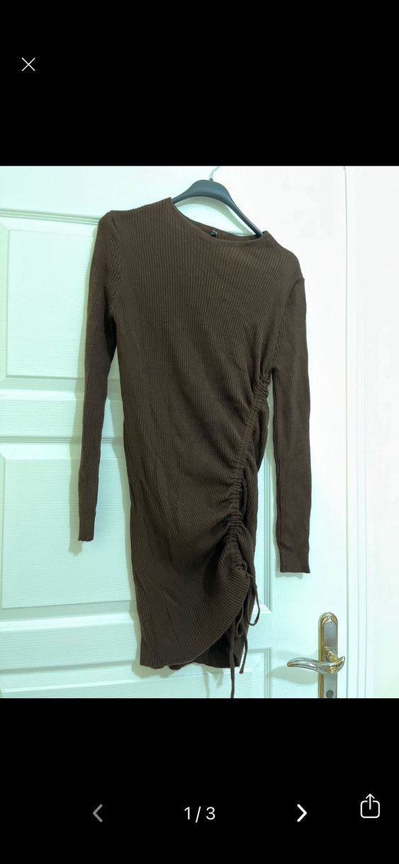 Kahverengi, uzun kollu ve bisiklet yaka, triko dokulu, yan tarafı büzgülü, fitted kesim elbise. Rahat ve şık, günlük kullanıma uygun.