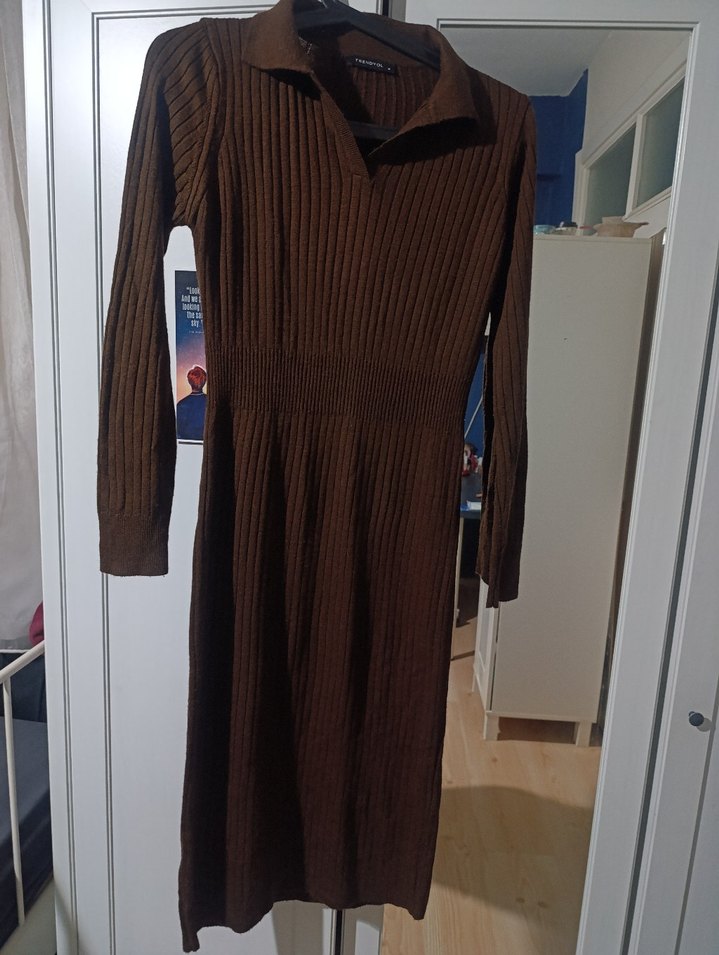 Kahverengi Uzun Kollu Triko Kadın Elbise