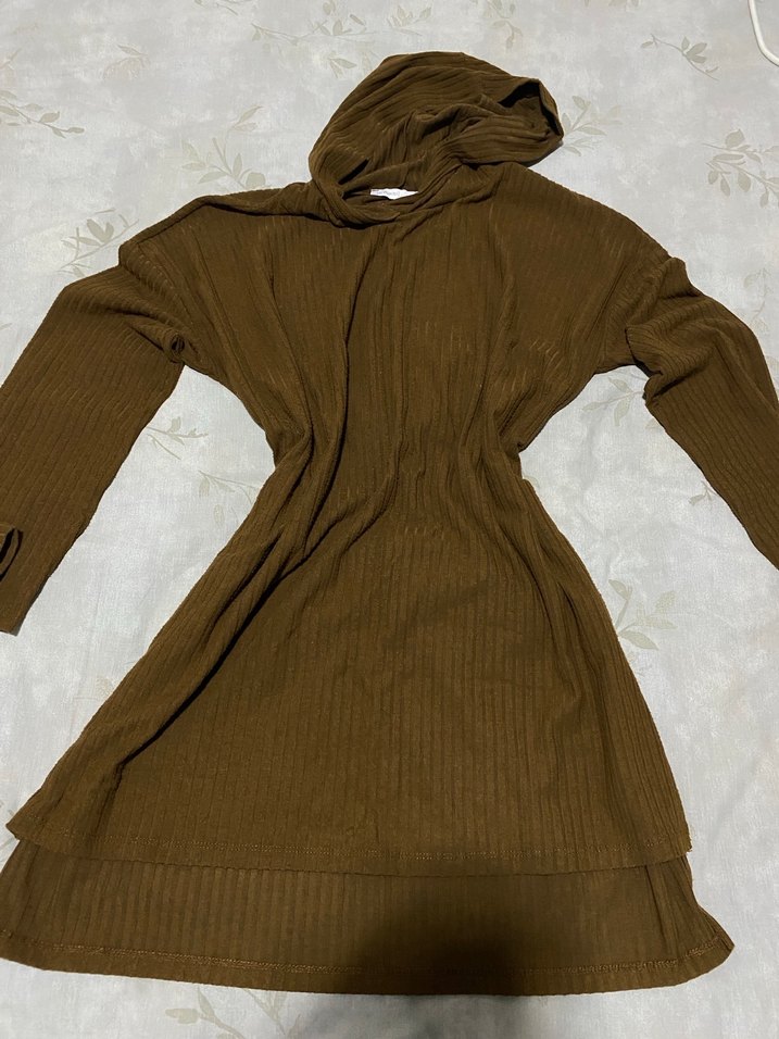 Kahverengi Uzun Kollu Triko kapüşonlu fitilli tunik