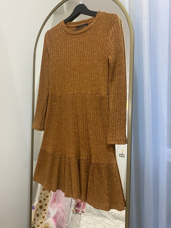 Kahverengi Uzun Kollu Triko Midi Elbise