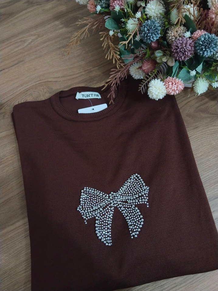 Kahverengi, uzun kollu, örme kumaştan yapılmış , bol kesim ve önünde taşlı fiyonk detayı, yuvarlak yaka ile rahat kullanım sağlar.