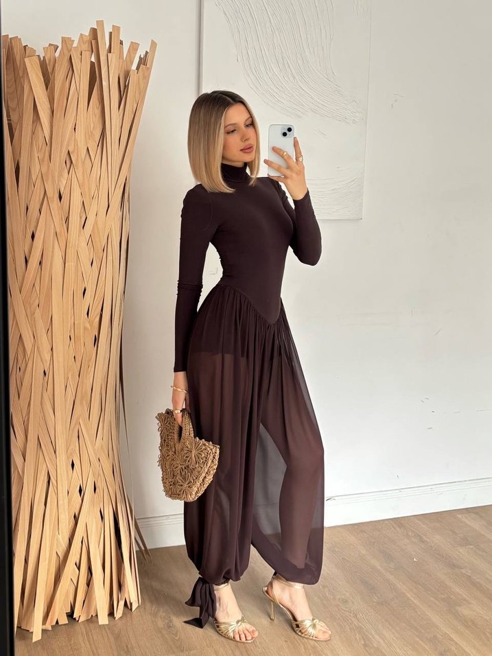 Kahverengi uzun kollu, yüksek yakalı ve bol kesimli uzun elbise. İpeksi kumaştan, minimal ve çağdaş tarza sahip, günlük kullanıma uygun, zahmetsiz şıklık sunar.