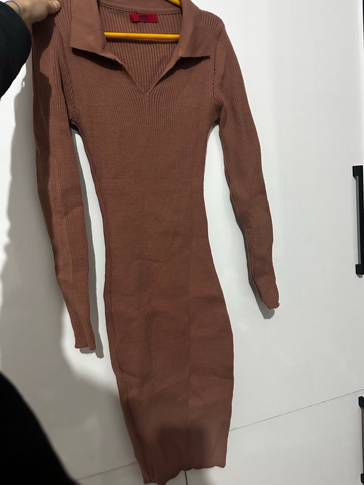 (1. Fotoğrafda ışık kaynaklı kahverengi görünüyor asıl rengi 2. Fotoğrafda mevcuttur.) Toz pembe uzun kollu ve V yaka detaylı, yumuşak sentetik kumaştan yapılmış, vücuda oturan uzun elbisedir. Rahat sokak stili için uygundur.