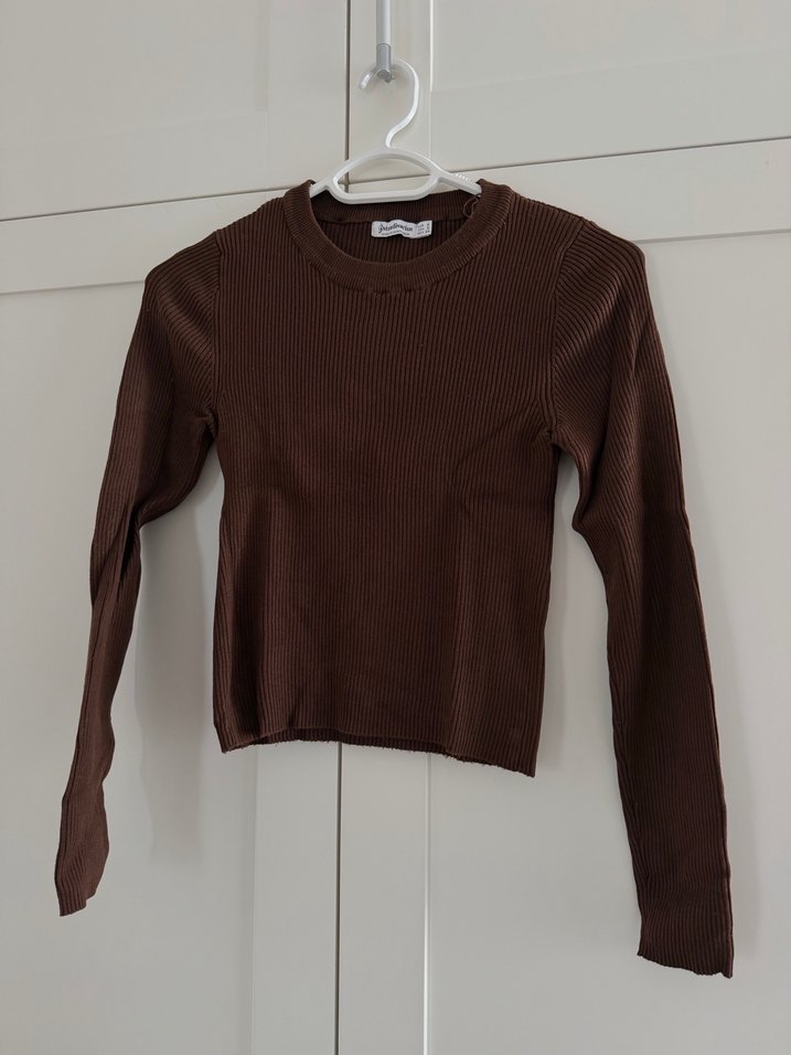Kahverengi, uzun kollu, yuvarlak yakalı, ince triko kumaştan yapılmış, sade ve minimalist tarzda, normal boyda ve vücuda oturan kazak. Günlük kullanıma uygun.