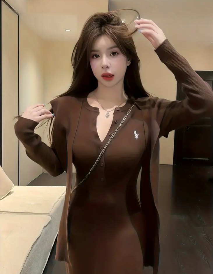 Kahverengi, uzun kollu, V yakalı ve şallı bu uzun elbise, ince kesimi ve ipeksi dokusuyla minimalist ve klasik bir şıklık sunar. ✨