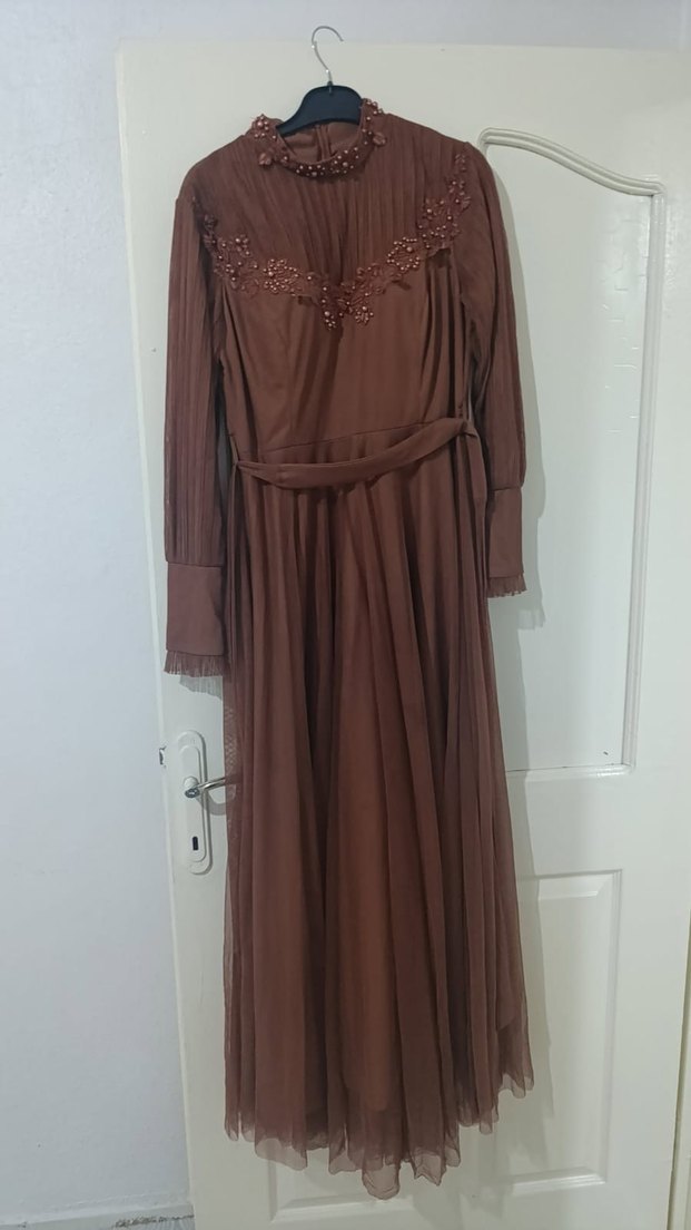 Kahverengi Uzun Kollu Vintage Abiye Elbise