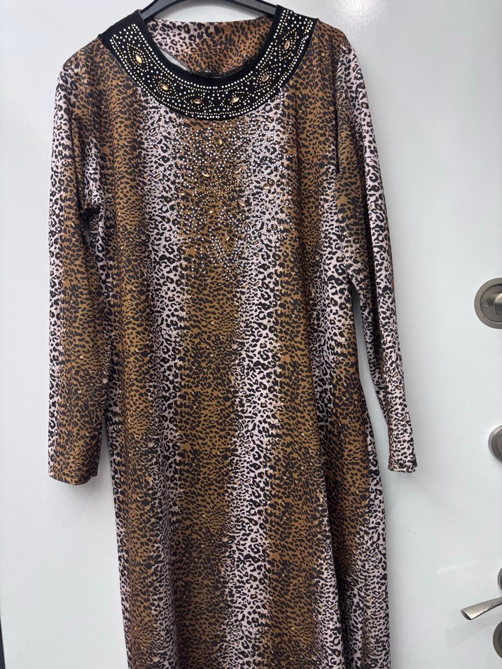Kahverengi yılan desenli, uzun kollu, bol kesim elbise . Yuvarlak yakada kürk detayları bulunur. Yumuşak sentetik kumaştan, günlük sokak stili için uygundur.