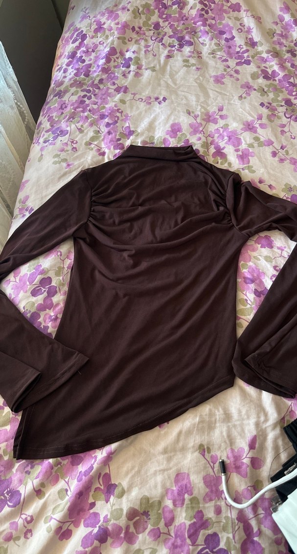 Kahverengi Uzun Kollu Yüksek Yakalı Drapeli Bluz