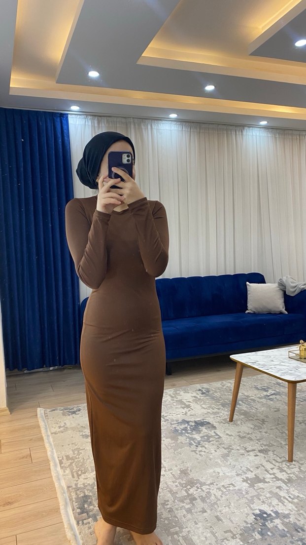 Kahverengi, uzun kollu ve yüksek yakalı, ince kesim bu elbise, ipeksi kumaştan yapılmıştır. Minimalist tarzıyla günlük kullanıma uygundur.