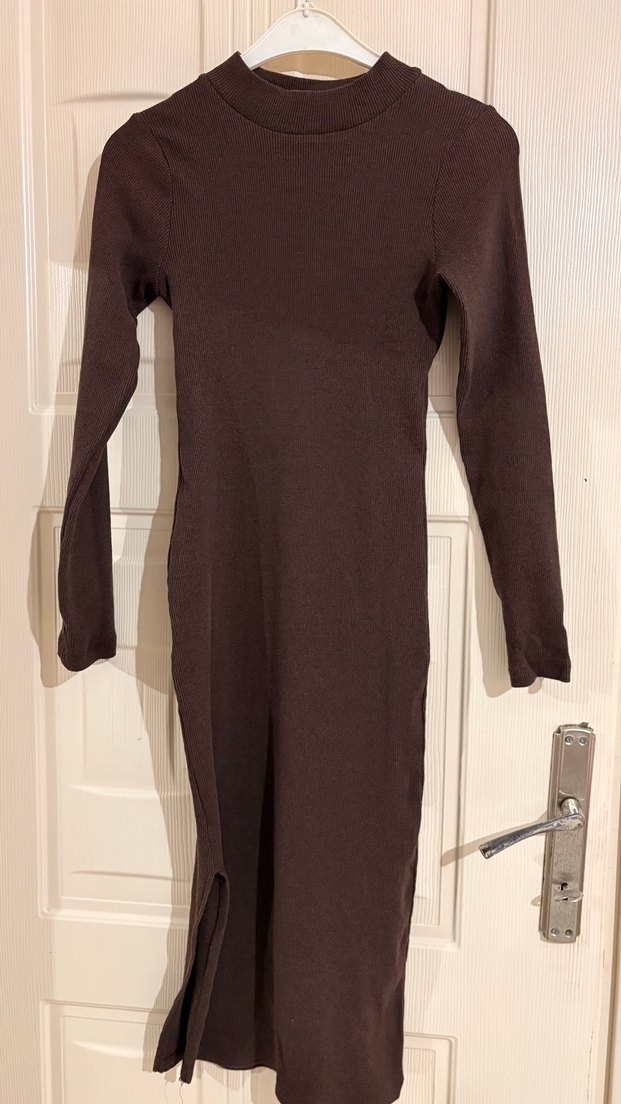 Kahverengi, uzun kollu ve yüksek yakalı yarım boğaz, hafif yırtmaçlı vücuda oturan uzun elbise. Yumuşak triko kumaştan, minimalist ve normcore tarzda günlük kullanıma uygun.