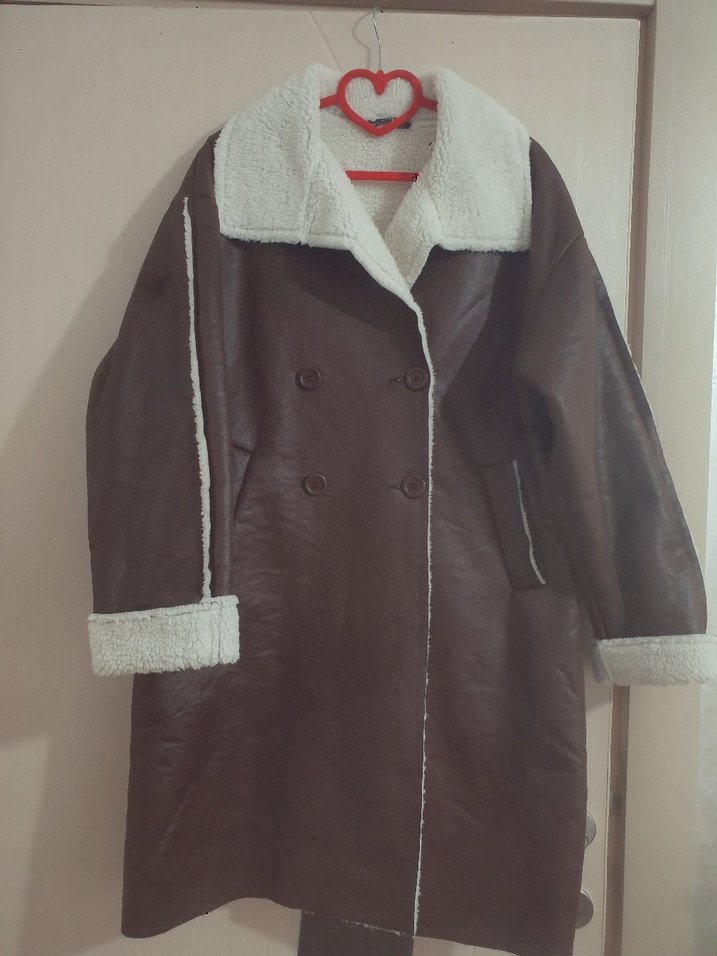 Kahverengi uzun deri ceket, kürk detaylı yakası ve manşetleri ile rahat ve salaş kesime sahiptir. Uzun kolludur, günlük kullanıma uygundur.