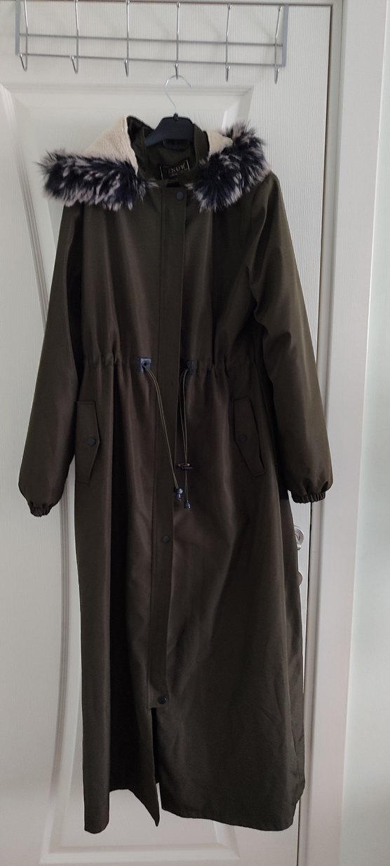 Kahverengi uzun, bol kesim, sentetik kumaştan yapılmış, kürklü yakalı ve belden bağlamalı kadın yağmurluğu. Uzun kollu, sokak stili için uygun. sadece fermuar bazuk öndeki orta düğmenin bir tanesi düştü takılabilir