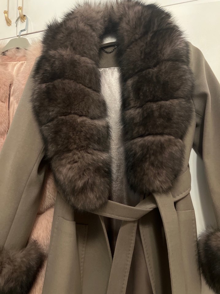 Kahverengi, uzun kesim, kürklü yakalı ve manşetli, notched lapel yakalı, strappy kollu, yumuşak fleece kumaştan kadın kaban. Günlük kullanıma uygun, çağdaş tarzda.gerçek tilki kürküdür s beden rahat kalıptır
