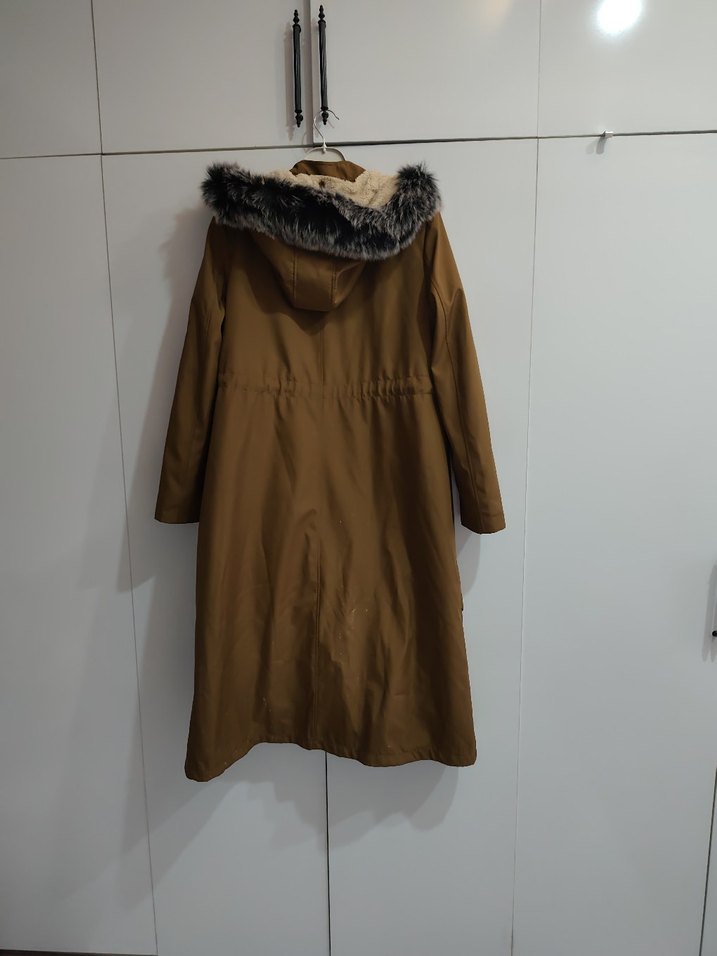 Kahverengi uzun kadın mont, kapüşonunda kürk detaylı ve yakalıdır. Bol kesim ve uzun kolludur. Yumuşak, sıcak kumaştan yapılmıştır, rahat ve şık bir sokak giyimi parçasıdır.