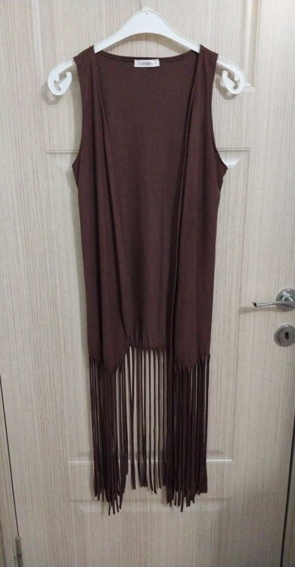 Kahverengi, askısız yaka ve bol kesim ile uzun püsküllü, dökümlü kadın yelek. Sentetik kumaştan, bohem tarzını yansıtır. Günlük kullanım için uygundur.