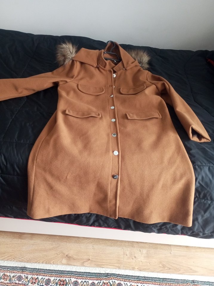 Kahverengi uzun kesim, bol rahat kadın kaban. Yumuşak ve sıcak kumaştan, kapüşonunda kürk detaylı, uzun kollu ve çıtçıt düğmeli. Günlük sokak stiline uygun.