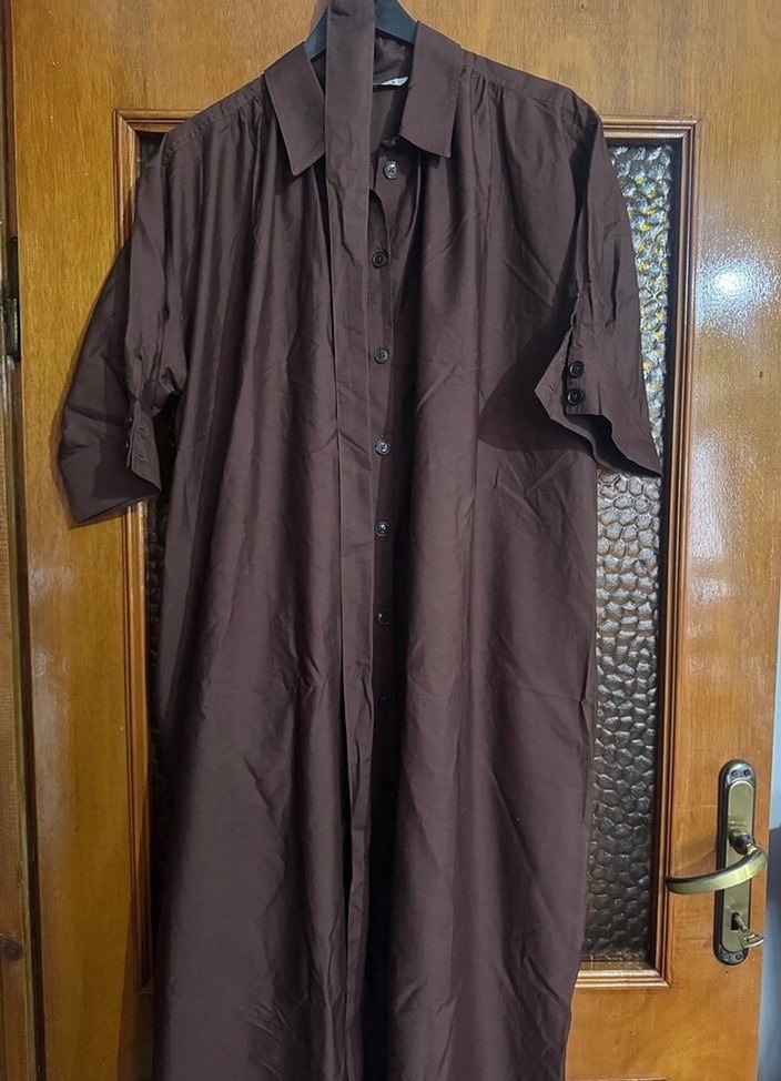 Uzun, salaş kesim kahverengi kadın elbisesi kısa kollu, düğmeli ve desen içermeyen minimalist sokak stili için uygundur.