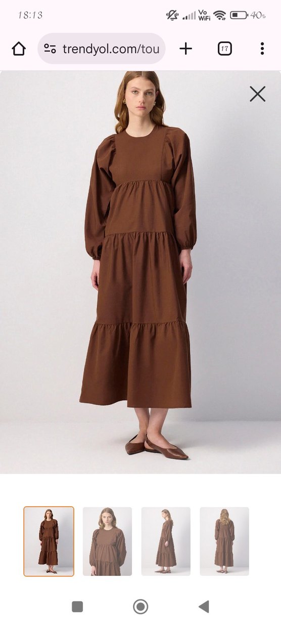 Kahverengi uzun elbise, salaş kesim, yuvarlak yaka ve balon kollu, yumuşak sentetik kumaştan üretilmiştir. Minimalist, zahmetsiz şıklık sunar, günlük kullanım için uygundur.