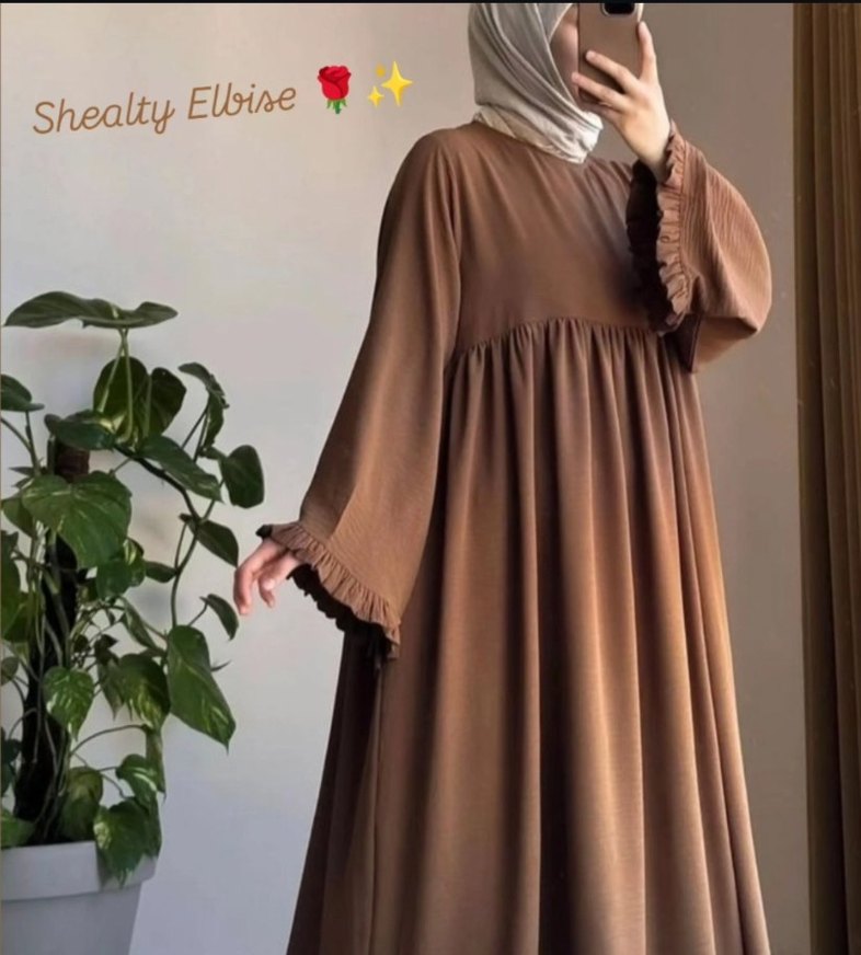 Kahverengi uzun, salaş kesim elbise, ipeksi kumaş ve fırfır detaylı uzun kollara sahiptir. Yuvarlak yaka ve sade bohem tarzda dikilmiştir.Beden ve boy için mesaj atın..