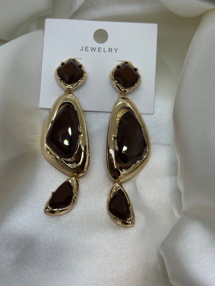 Kahverengi, sıralı desenli, parlak detaylı uzun küpeler, cesur günlük kullanım için uygun. JEWELRY markası.