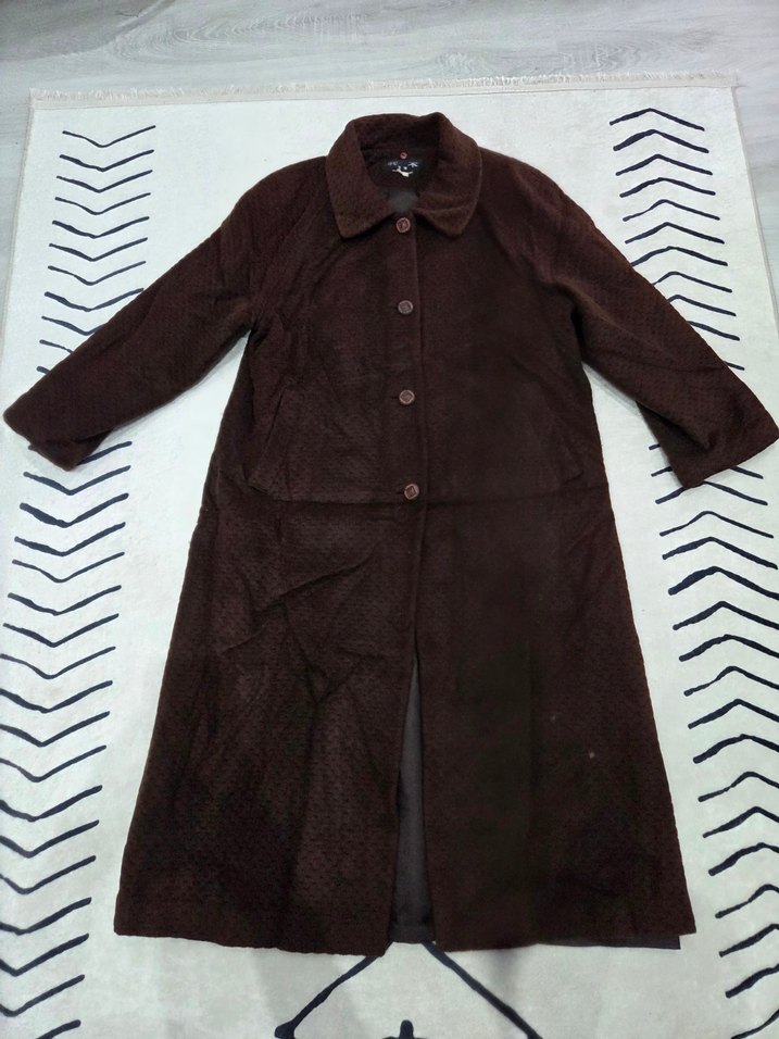 Kahverengi uzun süet kadın kaban, düğmeli ve uzun kolludur. ici astarli hic bir sorunu yok acı kahve rengi yurtdisindan alindi L/XL beden
