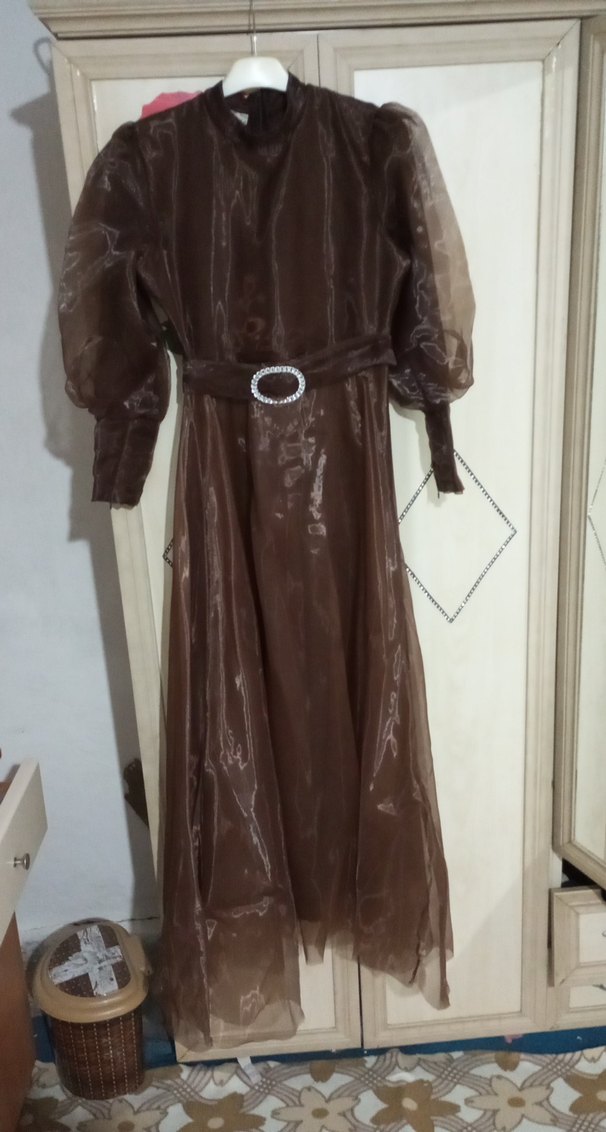 Yüksek yakalı, bol kesim kahverengi uzun elbise. Drapeli, tüllü kollari ve kemerli bel detayıyla tesettürlü abiye elbise düğünler için uygun.