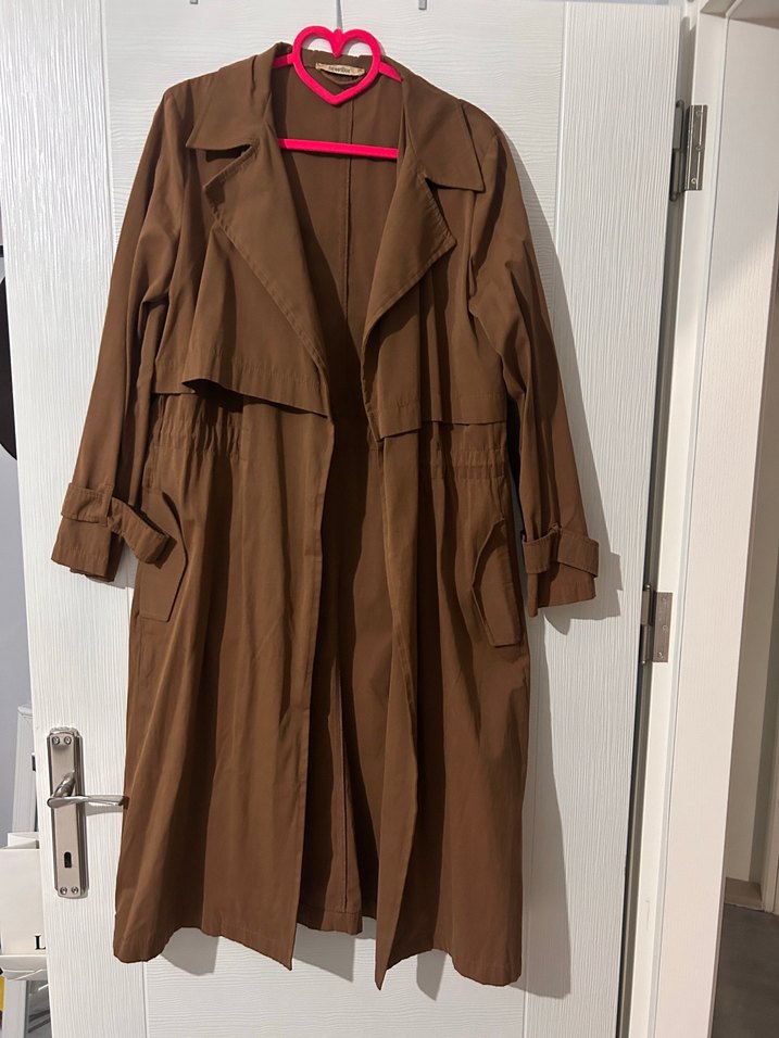 Kahverengi yumuşak kumaştan, bol kesim uzun trench coat. Strappy uzun kollu ve kesik yaka detayıyla Paris tarzı günlük sokak modasına uygun.Tam mevsimi. Çok az kullandım