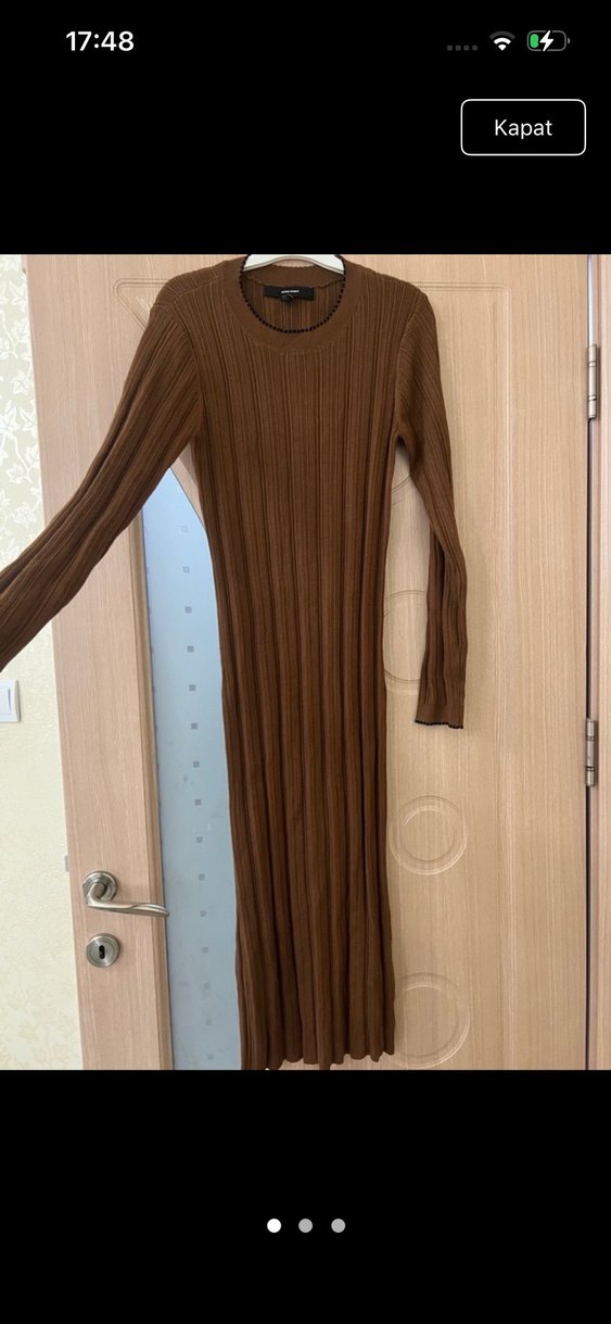 Kahverengi, uzun kollu, triko kumaştan yapılmış, vücuda oturan uzun elbise. Günlük kullanıma uygun, rahat ve şık.