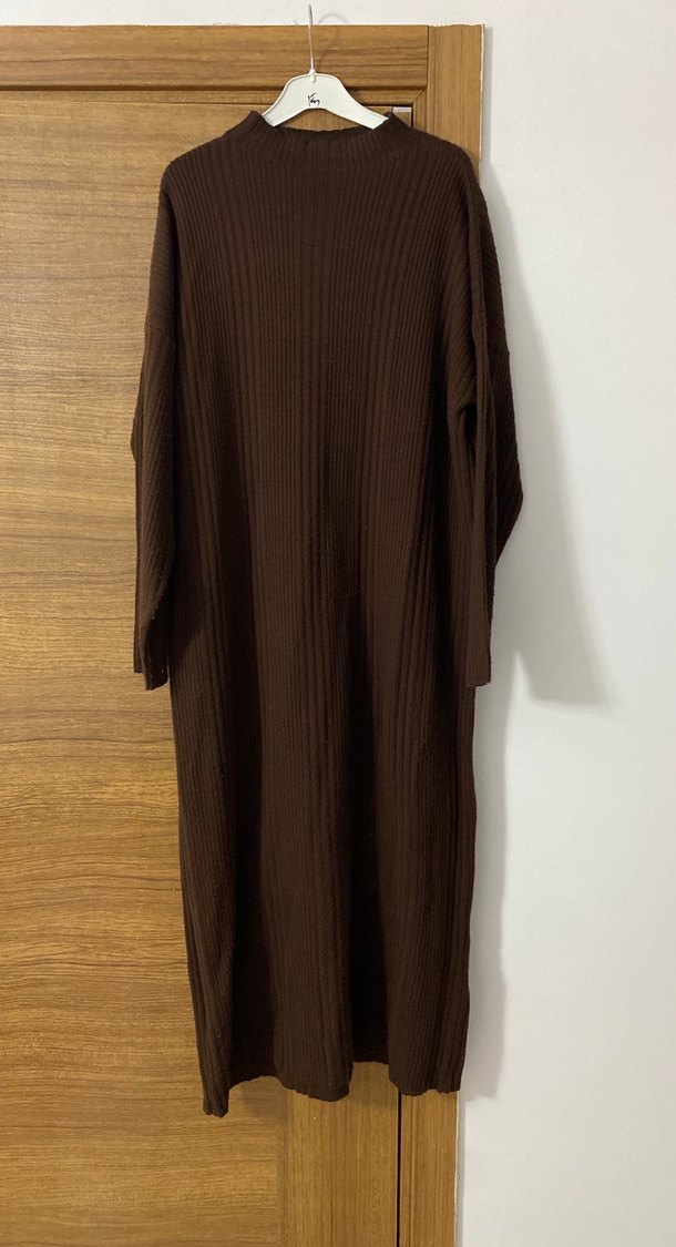 Kahverengi, uzun kollu, bol kesim ve boğazlı yaka triko elbise. Yumuşak dokusu ve sade tasarımı ile günlük kullanıma uygundur.