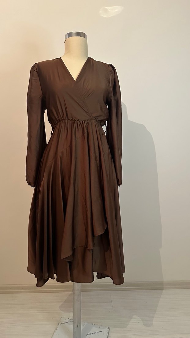 Kahverengi uzun elbise, bol kesim ve drapeli tasarıma sahip. V yaka ve uzun kolludur, ipeksi kumaştan üretilmiştir. Ofis için bohem tarzda.